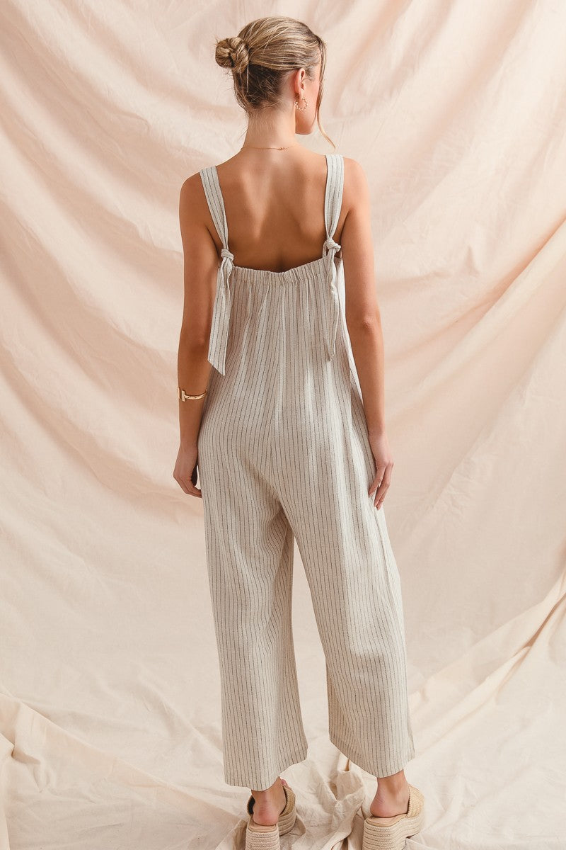 Button Front Stripe Linen Blend Jumpsuit Overalls